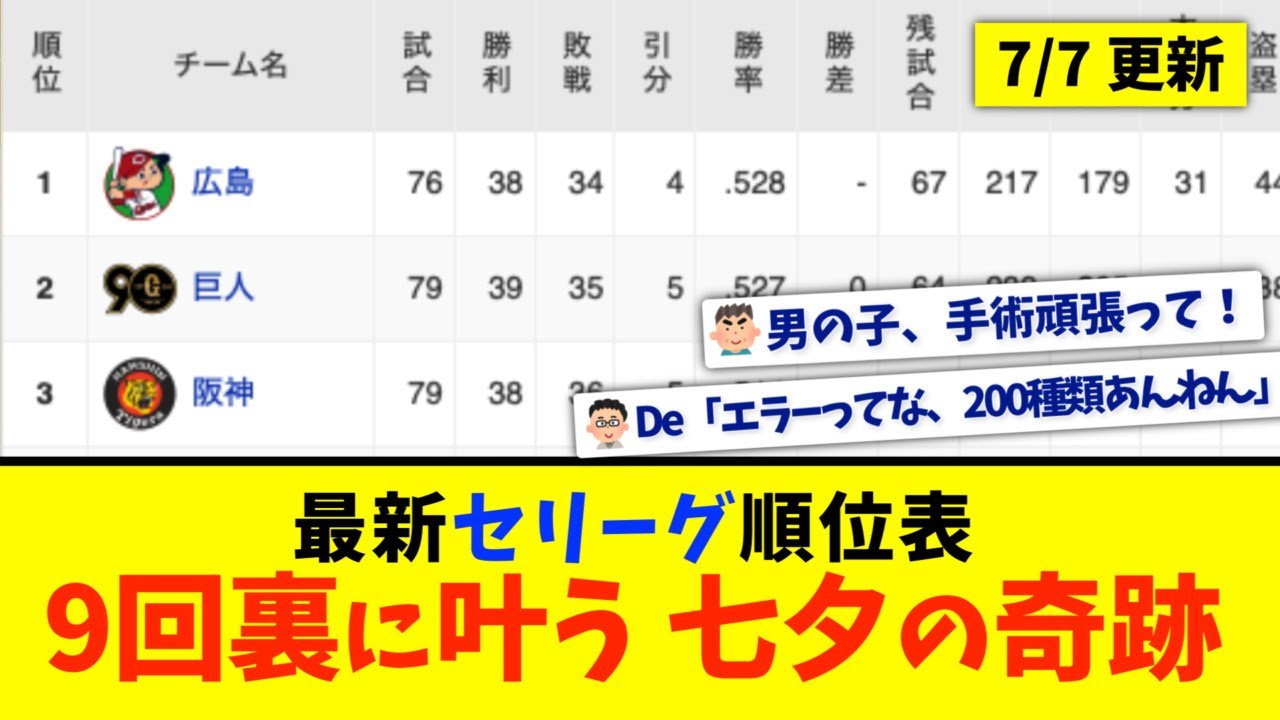 【7月7日】最新セリーグ順位表 〜9回裏に叶う七夕の奇跡〜