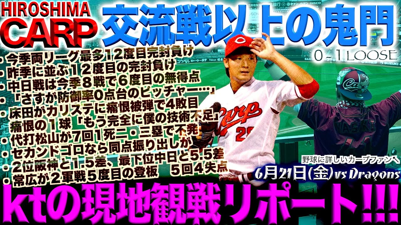 オートマオートマティック 自動スタートでは あお疲れ様ですKTです今日は6月の21 日ということで本日もKTチャンネルご 視聴いただきましてありがとうございます はいというわけで先ほど帰ってきましてえ お風呂の方ね先に入らせていただきました ま1日ね仕事もしていたということでえ 早くね動画を作らなくてはいけないところ 風呂先にえ失礼させてもらって現在時刻は 23時を回ったところまそれでもねあの 試合を見て帰ってきて今まだ23時って いうのはね早いような気がするんですけど もえ序盤はね結構両投手ランナー出し ながらというところだったんですけどもえ 試合の中盤から後半にかけてはえ非常にね テポよく試合が進んでいてもう20時半 回ったぐらいにはえ試合が終わっていたと いうことでえ帰ってきておりますはいと いうわけで久し久しぶりのえリーグ戦再開 ということで楽しみにしていたんですけど もえ残念ながら中日ドラゴンズに0対1で 破れるとえいうことでサムネイルもね出て おりますけどもえ交流戦をねなんとか 勝ち越して追われても奇問じゃないねとえ いうようなねえ話をしていたところですね えやっぱりバンテリンドームは未だに奇問 ということで勝てませんねはいということ で順番に見ていきますと今期両リーグ最多 の10度目12度目の完封負けプラス2 試合か3試合ねえスコアレスゲームという のもありますはいでえ早くも昨期に並ぶ 去年に並ぶえ12度目の完封負けとえいう ことでですねえちょっと多いですね試合の 方がえ現在ですね62試合か62試合を 消化した時点で去年と同じ完封負けとえ いうことになっておりますちょっと悔しい ですはいでドラゴンズ戦はえ今期8試合で 6度目の無得点試合とえいうことで ドラゴンズから点取れませんね困っちゃい ますね新井監督はねえそこまで苦手意識 持ってないよという風にねえ強がっており ましたけどもまこれは間違いなくねえ ちょっと苦手な分類に入ってきますんでね えまた明日やり返したいなという風に思い ますで高橋博人投手をさすが防御率0点台 のピッチャーという風に評価しておりまし てまランナーね出すものの点を取れなかっ たということでまその辺がやっぱりねえ いいピッチャーのえ予言かなという風に 思いますはいで一方のねとだとも 素晴らしいピッチングでしたえカリステ 選手にホームラン打たれるもののという ところでねま4敗目ということでえ7回 投げてね1失点で4杯目というのは ちょっとかわいそうなんですけどもあの 常田投手自身はもう完全に僕の技術足と いう風に言ってるみたいなんですけどもま 1点だからねえそんな攻める攻め るっていうかも素晴らしいピッチングだっ たという風に思いますちょっと席だけさし て くださいごめんなさいねちょっと最近咳が 出るんですよねはいでえその続きを見て いきますとえダドの松選手がね7回1 アウト2塁3塁で登場してえ全身守備 ショートと13塁かなだけが全身守備 セカンドがね唯一後ろに下がっていたんで セカンドゴロを打てばえ同点にはなってい たというところで小ところでホームタッチ アウトということでちょっとね残念なえ 打席という風になりましたはいでえ2位の タイガースがですねえ勝ったということで 1.5ゲーム差という風に縮まっており ますまただねターズが勝っても同じような あの感じなんでまそこはねどっちが勝って も一緒かなとえカープが勝つしかないと いう状況ではあると思いますはいそして さらに最下のドラゴンズそれから スワローズとのゲーム差も5.5までねえ 縮こまっておりますんでえパリーグの首位 と2位のさ以上にですねえセリーグは首位 と最下のえ差が縮こまっているということ なんでねま今一応カープがね一応え周囲に いますけどもえ本当にね全然安心できる とこではないという風に思いますんでなん とかこの流れ断ち切りたいなというふに 思いますはいで一旦1軍の話から飛んで ファームの方見ていきますと常広投手がえ 2軍戦で5度目の登板ということで5回を 投げて4失点ま自責はなかったということ なんですけどもまピリッとしない内容だっ たとえいうようなねえ感想が結構ね多く見 られましたで佐藤選手の方はねえま交流戦 終わったということで2軍に1回戻ってと いうような形にはなったんですけど早速2 本ヒット打っておりますし本人も1軍では 通用しないないバッティングだとえいう風 に自覚がありますんでねやっぱりこやって 一軍に打席立たせ1軍のえ打席をねたく たくさん立たせたことによってえ課題と いうのが明白になっておりますしえ本人も ね非常に頭のいい選手なのでえその辺も 自覚してえこれからね2軍で取り組んで いってくれるとえいう風に信じております んでねまたえ今期のどこかでですねえ是非 とも一分に上がってきて欲しいなという風 に思いますはいというわけで本日の試合を ねえ振り返っていく前に恒例となっており ますスタメン発表ちょっとどの感想とえ いうことで今日の打順ね