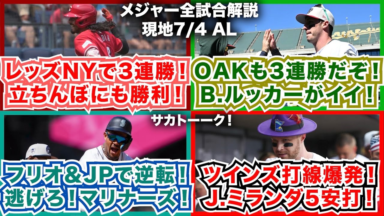 【AL7/4】レッズがニューヨークで3連勝!試合前の立ちんぼ対決にも勝利!アスレチックスも3連勝だぞ!B.ルッカーがイイ!フリオ&JPで逆転!逃げろマリナーズ!ツインズ打線爆発!J.ミランダ5安打!