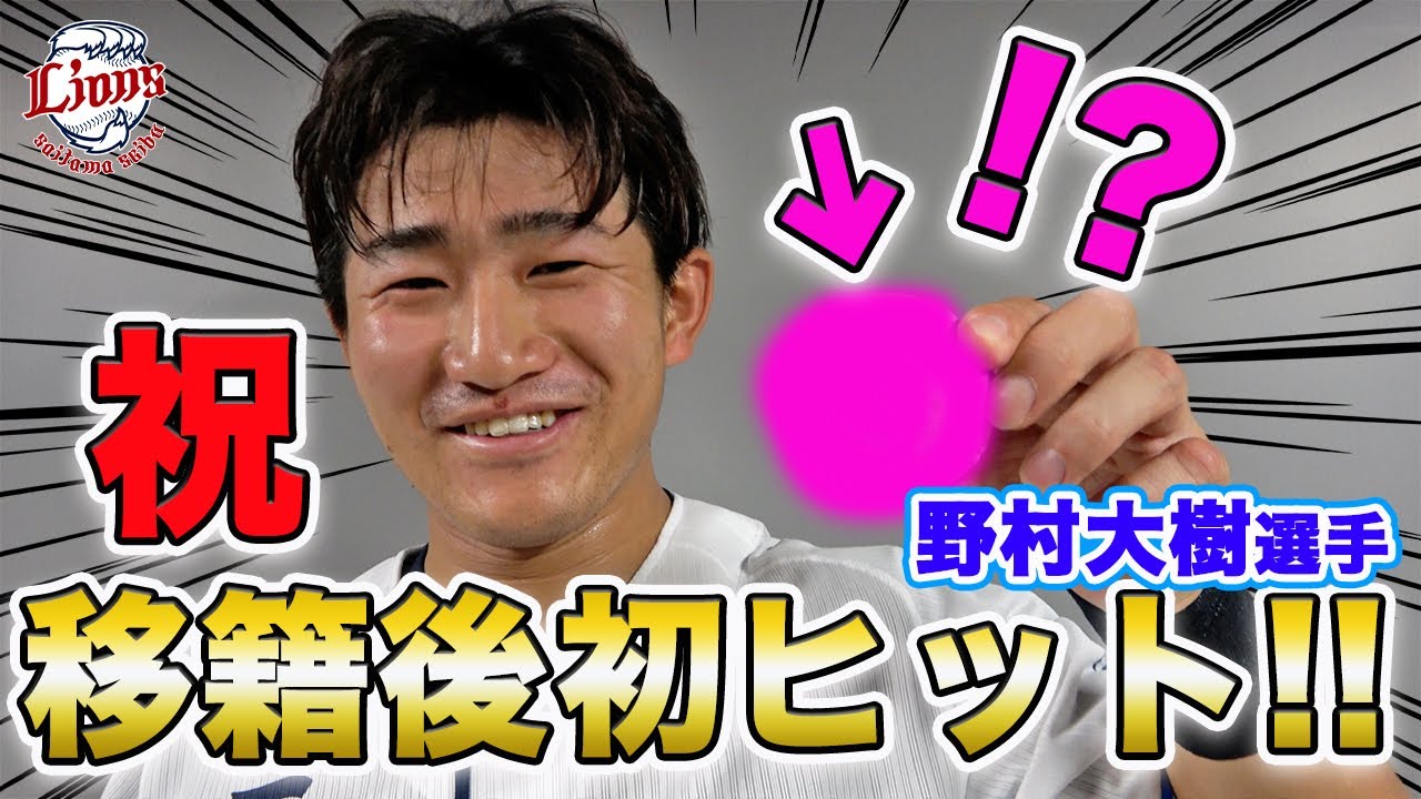 そうすねまあの昨日ああいうことがあって まチャンスでも映てなかったちゃですけど ま次の宮席目のチャンスで絶対売ってやろ うって気持ちがそうすね強かったんで ほっとしましたそうすねまやっぱり移籍し てきてまなかなか2試合ヒットが出なかっ たんでま今日ああいうチャンスの場面で 打ててなんて言うんですかねライの皆さん も祝福してくれてすごく嬉しかったです はいはらいましたはい これは銀次郎さんに初日おめでとうこのボ って言われてされました多分 こっちこっちす こは2つもいましたこっちはケースか なんかに入れて飾ってこっちはマサージ 使いますえ今日初ヒット打つことできたん ですけどチームは破れてしまってまた仙台 で試合があるんでえベルーナに帰ってくる までにえ3連勝して帰ってきたいと思い ますのでえ応援よろしくお願いします応援 ありがとうございまし たってますからまセター方向に行けるとね 確率上がるかなと思いますけどねさいた初 ヒットが出ましたそしてセカンドランナー は回さずここはストップですチーム加入後 Hのランプがりました野村 大超照明これがライオンズ加入後初 ヒットH [音楽]