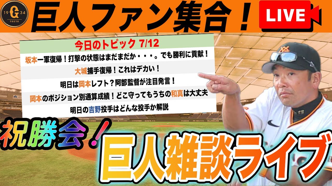 【巨人ファン集合】6連勝キタ!サヨナラ勝利の祝勝会と明日のオーダー予想など巨人雑談ライブ 読売ジャイアンツ