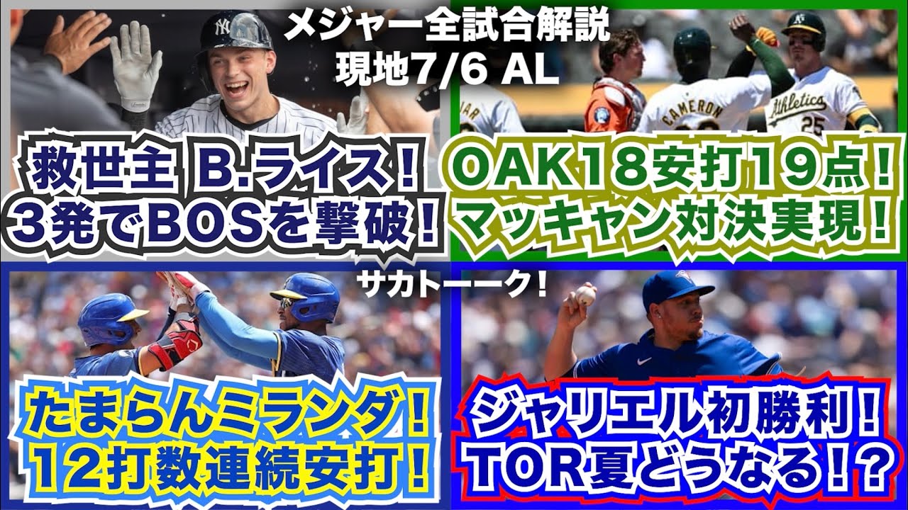 【AL7/6】救世主B.ライス!3発でレッドソックスを撃破!アスレチックス18安打19得点!捕手のマッキャン同士が投打で対決!たまらんミランダ!12打数連続安打!ジャリエル初勝利!TOR夏どうなる?