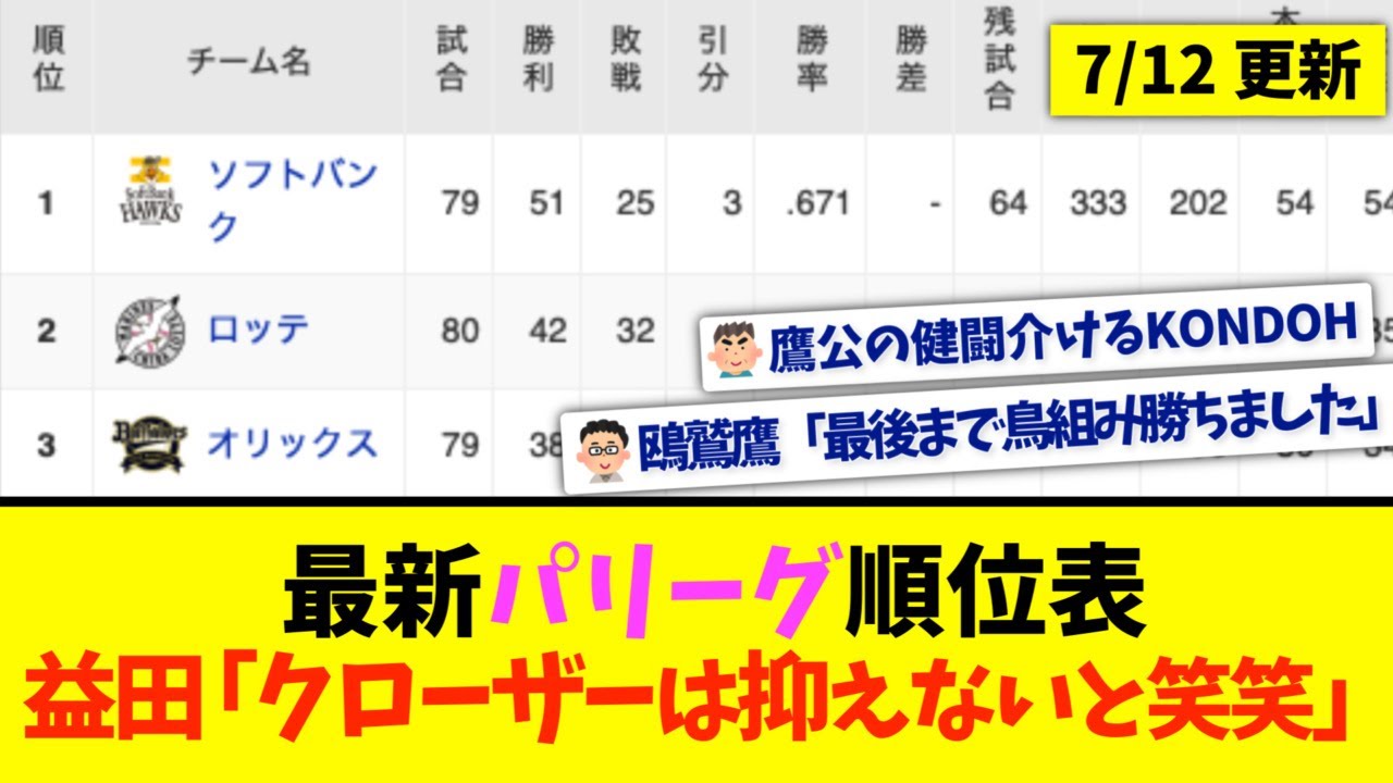【7月12日】最新パリーグ順位表 〜益田「クローザーは抑えないと笑笑」〜