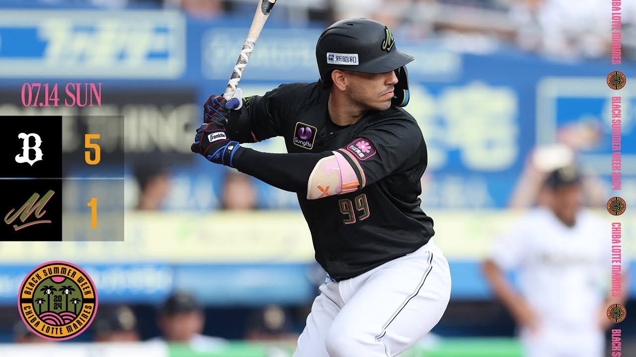 ブラックサマーウィークということ で球場の外でそして中で色々なイベントが 行われてい [音楽] ますマリンドの先発は田中春谷でしたその 立ち上がり1番の大里からボールで空振り 三振 森に対してはまっすぐで打ち取ります1回 2回と良かったんですよねいや本当ね1回 は本当にねこは5回ぐまでノヒットで行く んじゃないかなとはいそんなピッチング だったですよね一方バファローズの先発 斎藤介立ち上がり請求が乱れてノーアウト 満塁4番の 外センターへ伊勢フライまずマリンズが これで1.5取りますが実はこの回1点 止まりでしたこの1点止まりが響きました ねですね ええまフランコはね1点取っとけばはい また変わったでしょうけどねフランコは1 アウト3塁1塁でキャッチャーへの ファール [拍手] フライでこの後2アウト満塁としたんです [音楽] ががァ へのファールフライということで1点 止まりに1回の裏は終わりまし [音楽] [拍手] [音楽] た3回のバファローズ2アウト1塁で1番 の 大里1塁戦を破り ますタイムリー3 ベース本宮が帰ってきて1対1の同点 [拍手] [音楽] 4回ですこの回の先頭森フォアボール4番 の西川ライトスタンドへツラホーム ラン甘く入ったスライダー西川が見逃し ませんでした3対1になります [音楽] そしてバファローズ先発の斎藤京介これは 4回のピッチングです佐藤俊高めの 真っすぐ打ち上げてセカンド フライそして岡が倒れて安田は三振2回 以降斎藤介が立ち直り ます5回のバファローズ2アウトから大2 ベース2番の 宇宙間の真ん中を破るタイムリー2 ベースバファローズが2アウトから追加点 4対 1田中春谷は5回まで投げまし たそして斎藤京介も5回まで投げましたが これは5回藤原の強い打球セカンドの太田 のフインプレーがありました プレでし た小川はキャッチャーへのファール フライ先発の斎藤は5回んだ1点でゲーム をまとめてい ます7回マウンドに コルデロ2アウト2塁で太田です太田今度 は引っ張って3塁戦を破るタイムリー2 ベースさんここも2アウトからだったん ですよねそうなんですよね ええ今日は2アウトから失点 というケースが目立ちましたそして7階裏 2アウト3塁で藤原に期待がかかりました がここは山田が抑えまし [音楽] た5対1で9回バウンドにはペルドモ最後 は中村翔吾空振り三振で試合 終了5対13連戦の3戦目はバファローズ が取りまし た斎藤が2勝目をマークしています