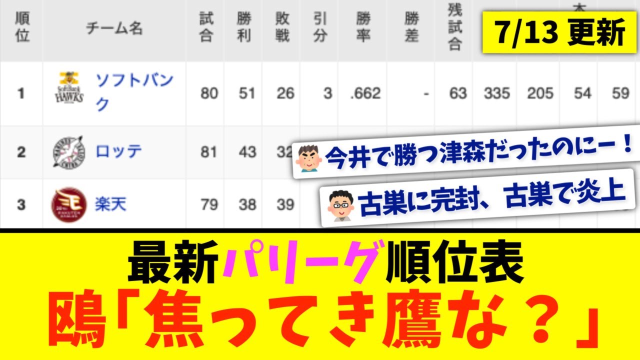 【7月13日】最新パリーグ順位表 〜鴎「焦ってき鷹な?」〜