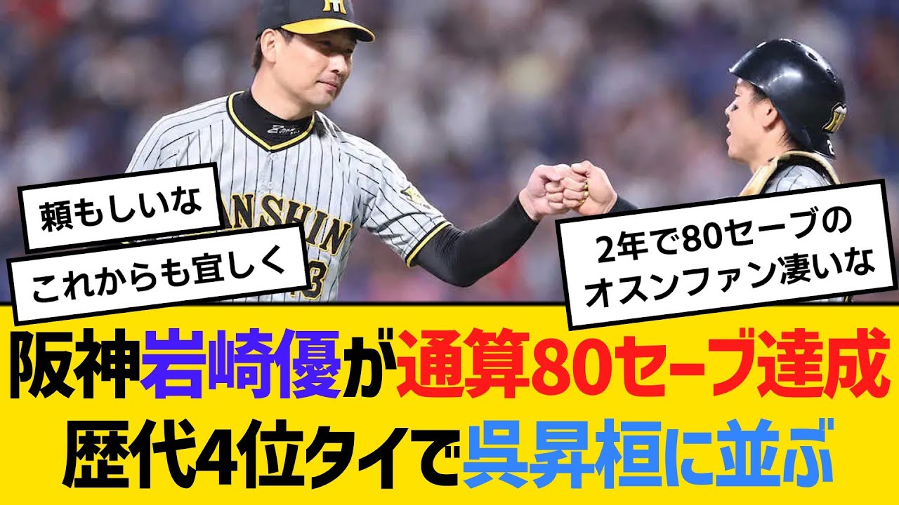 阪神岩崎優が通算80セーブ達成、球団歴代4位タイで呉昇桓に並ぶ 【ネットの反応】【反応集】