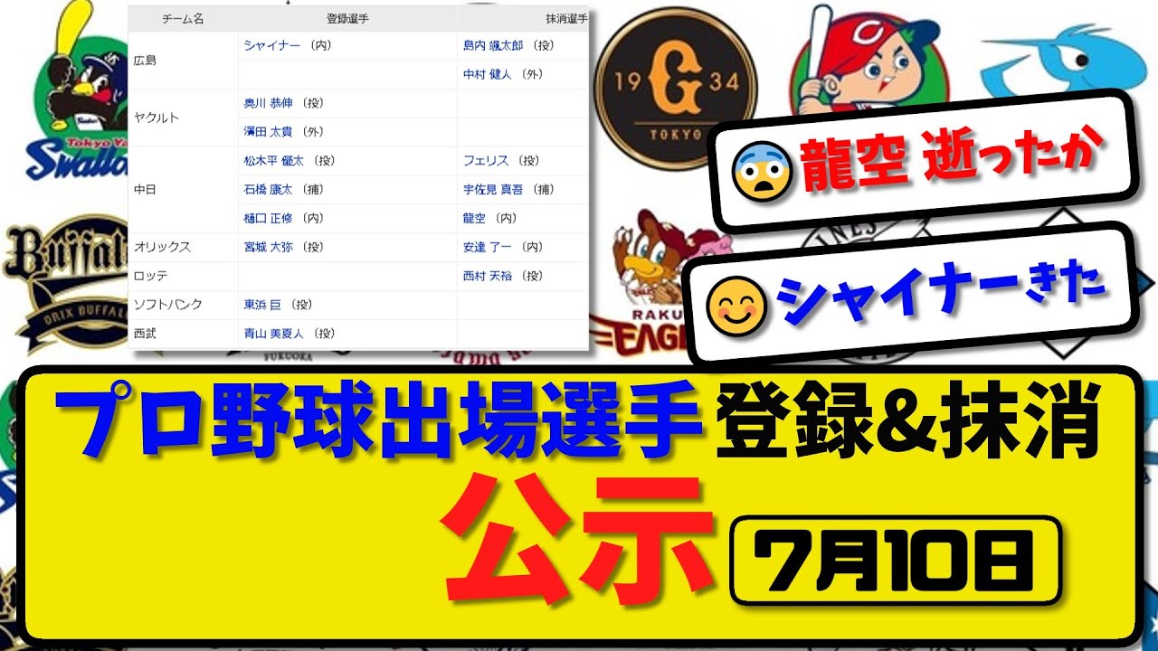 【公示】プロ野球 出場選手登録&抹消 公示7月10日発表|広島島内&中村 中日フェリス&宇佐見&龍空 オリ安達 ロッテ西村ら抹消|広島シャイナ ヤク濵田 中日石橋&樋口ら登録【最新・まとめ・反応集】