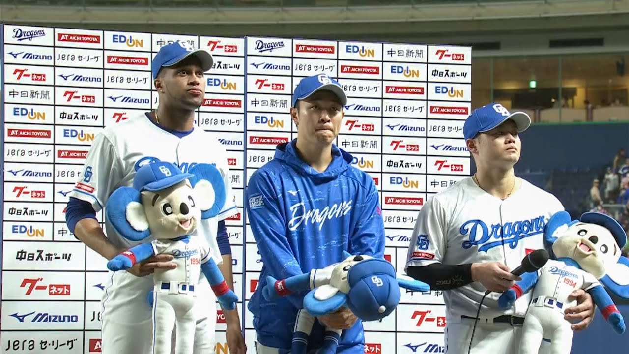 放送席放送席ヒーローインタビューです 今日のヒーローは3人です細川せ選手 そして高橋手ライデルマルチネス手 ですまずは細川選手から伺います 今シーズン第15ホームランナイス バッティングでしたありがとうござい ます1点をした後の打席でし打席に入り ましたかえーま本当に最近打点も稼げて ないのでえチームに迷惑をかけててかけて いてえ本当にえ主さんに続けて良かった ですここ2試合ヒットが出ていませんでし たそして今日は6番での起用でしたその 辺りというのはどんな風に感じていました かいやもう打順は関係なくえやれることを やるだけと思ったのでえいい形のホームラ になって良かった です村上投手のフォークボールを捉えたか と思いますが打球の手応えというのはどう でした かいや手応えはえなかったですけどえ バットに当たってくれて良かった です体勢崩されたようにも見えましたけど よく飛んでいきましたねはい飛んでくれて 良かった ですそして隣には高投手がいますが今日は 外野になかなか打球が飛びませんでした 細川選手の時には1球も問いませんでした がピッチングどんな風にご覧になってまし たかいやもうすごいピッチャーなのでもう 飛んでくる気配は一切なかった ですさあ今日 で2年連続の2桁ホームランということに なりましたこの点についてはいかが でしょうえまずは2桁えせ でまそこは良かったと思いますしえ今年は 去年以上に打ちたいと思ってるのでえこれ から頑張りたいと思い ますチームとしては連戦真中です明日以降 のゲームに向けて一言お願いしますえ明日 からもえ連勝できるように頑張っていき ます応援よろしくお願いし ますまずは今シーズン第ホームラン細川手 でし た続きまして6勝目高橋手ですナイス ピッチングでしたありがとうござい [拍手] ますチームとしては3連敗中でこの名古屋 に戻ってきましたどんな思いでマウンドに 上がりましたかはいえとりあえず僕は先制 点を与えないこと相手のピッチャーより 長くマウンドにいることを意識して マウンドに上がりまし たそうした中で2回に隣の細川選手の ホームランもあって1挙3点大援護になっ たんじゃないですかいや本当に細川さんが 打ってくれたおかげで僕も楽に試合を 進めることができましたし細川さんの おかげで僕がこうやって頑張っていること で はいありがとうござい ます今日は8回まで投げました3ガの ピッチングピンチの場面では少しギアを 上げてという形も見えましたが今日の ピッチング振りていで はいえま前回 と同じようにはい弾数少なくしっかりと 投げることだけを意識して頑張りまし た8回最後満塁にまで行きましたけれども しのぎましたねはいえバック見たら本当に 心強い守備の方々ばかりだったのではい 良かった ですそしてお隣マルティネス手が今日 150武達成ということになりました高橋 手から見てどんなピッチャーですかいや もうドラゴンズの鉄壁のリリーフ人がいる おかげで僕たちが思い切って初回から 投げれているのではいまるちゃんいつも [拍手] ありがとうさあオースター前あと1回高橋 あるかと思います次回に向けて一言お願い しますはいえ僕は結果を残すことだけ考え て頑張り ます見事6正面を上げました高橋白投手 ですさあそして史上19人目ドラゴンズで は2人目150西武達成ライデル マルティネス投手 ですまずはこの拍手そして記録達成に際し ていかがですか [音楽] まずにファンの方たがいつも素晴らしいし てくれてありがとうございます今日は ファンの皆さんの前で150げてとても 嬉しい ですはし ピッチングでっ [音楽] え昨日はうラルマ見たです今日はつの ライル見れたと思い ます隣の高手が8回0でついでくれました どんな思いでブルペンでは見ていたん でしょう え高橋手は素晴らしいピッチャーで今日も 素晴らしいピッチをしてくれましたえ9回 行く準備をして待ってましたいつも高さん ありがとうござい [拍手] ます今日はいつものマルティネス投手いう 形3人で閉めました今日のピッチングは いかがでした [音楽] え今日はブルからしましたしマ上でいい ピッチングができたと思い ます育成からスタートをしましたそして8 年目150まで西武を積み上げましたここ まで [音楽] えまず最初にこのように日本で契約して もらってドラゴンズに感謝したいと思い ますドラゴンズありがとうござい ますえそして皆さんのファンの皆さんも 晴しもの応援ありがとうござい [音楽] ます はり後に向けて力強い込お願いし [音楽] ます明日も全力で戦いますファンの皆さん が喜んでに頑張りますので明日も皆さん 応援よろしくお願いしますい [拍手] そしてライデルマルチネス手でした大 どうぞ