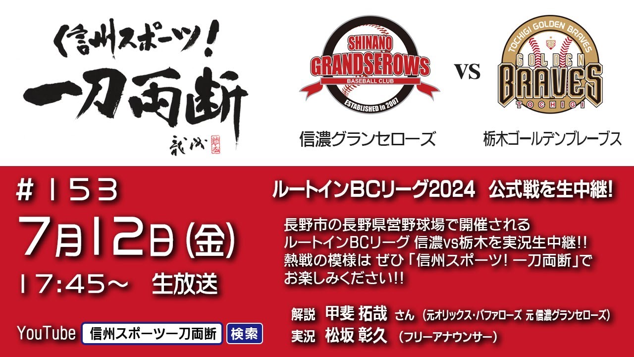 信州スポーツ! 一刀両断 153 ルートインBCリーグ 信濃グランセローズ vs 栃木ゴールデンブレーブス 公式戦を生中継! お楽しみに