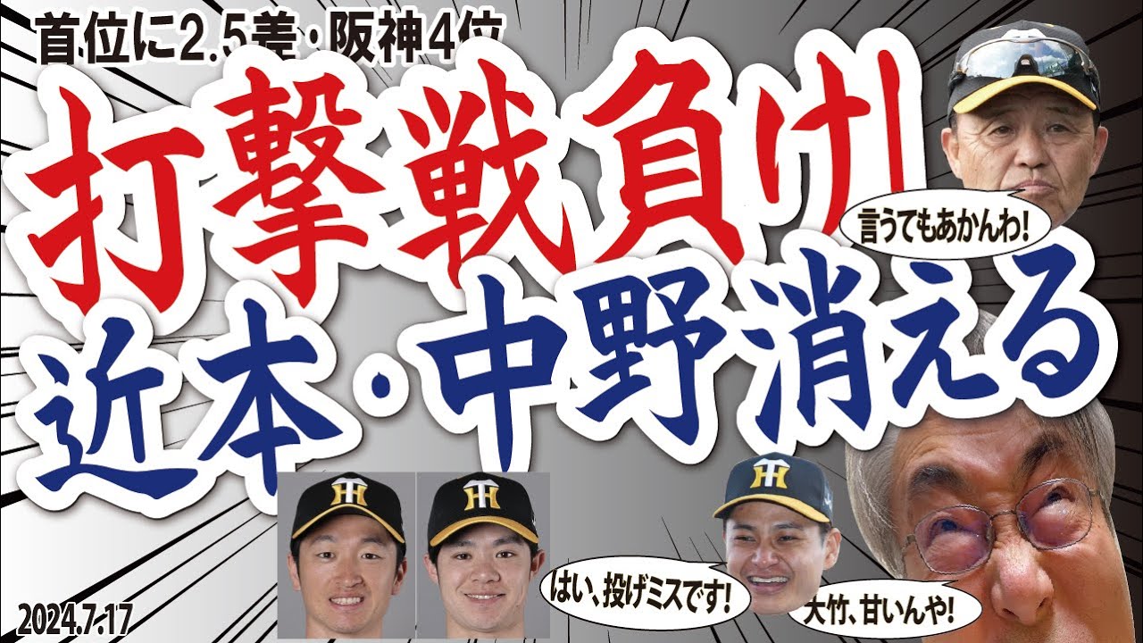 2024.7.17 巨4-3神 先発大竹・5回途中4失点で降板、拙攻・中途半端で1点届かず、Tスタメンに近本、中野の名前なし