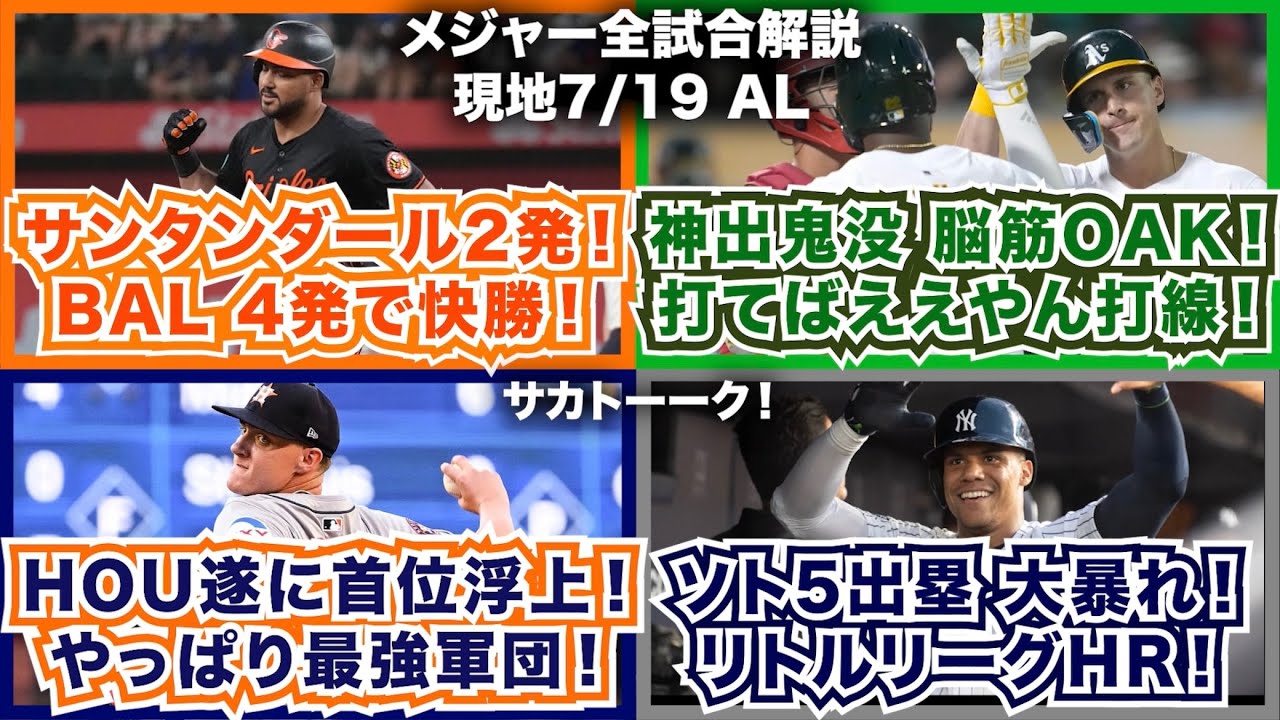 【AL7/19】サンタンダール2発!オリオールズ4発で快勝!神出鬼没の脳筋アスレチックス!打てばええやん打線!アストロズ遂に首位浮上!やっぱり最強軍団!ソト5出塁で大暴れ!リトルリーグHR!