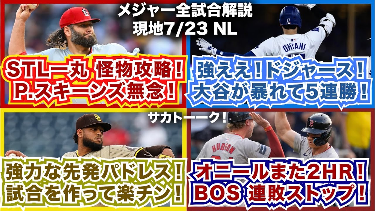 【NL7/23】カージナルス一丸となって怪物攻略!P.スキーンズ無念!強えドジャース!大谷が暴れて5連勝!強力先発パドレス!試合を作って楽チン!オニールまた2HR!レッドソックス連敗ストップ!