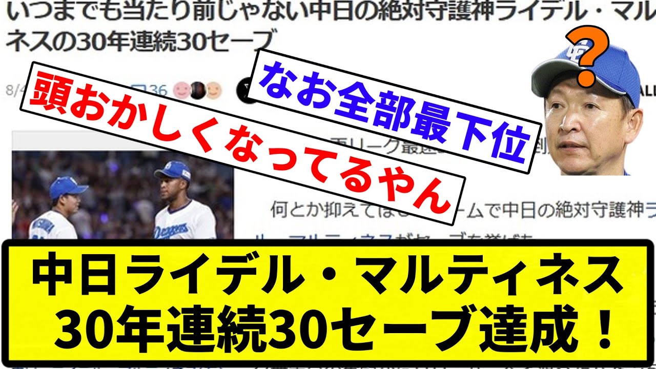 【生まれる前から守護神や】中日ライデル・マルティネス(27)、30年連続30セーブ達成【なんG集】【プロ野球反応集】