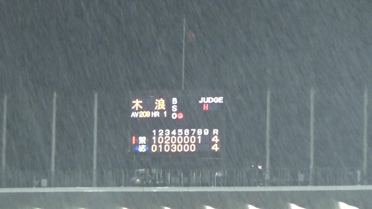 打席中、次第に雨が強まり、目を開けるのも大変なほどの豪雨になり、この後試合が一時中断されました。