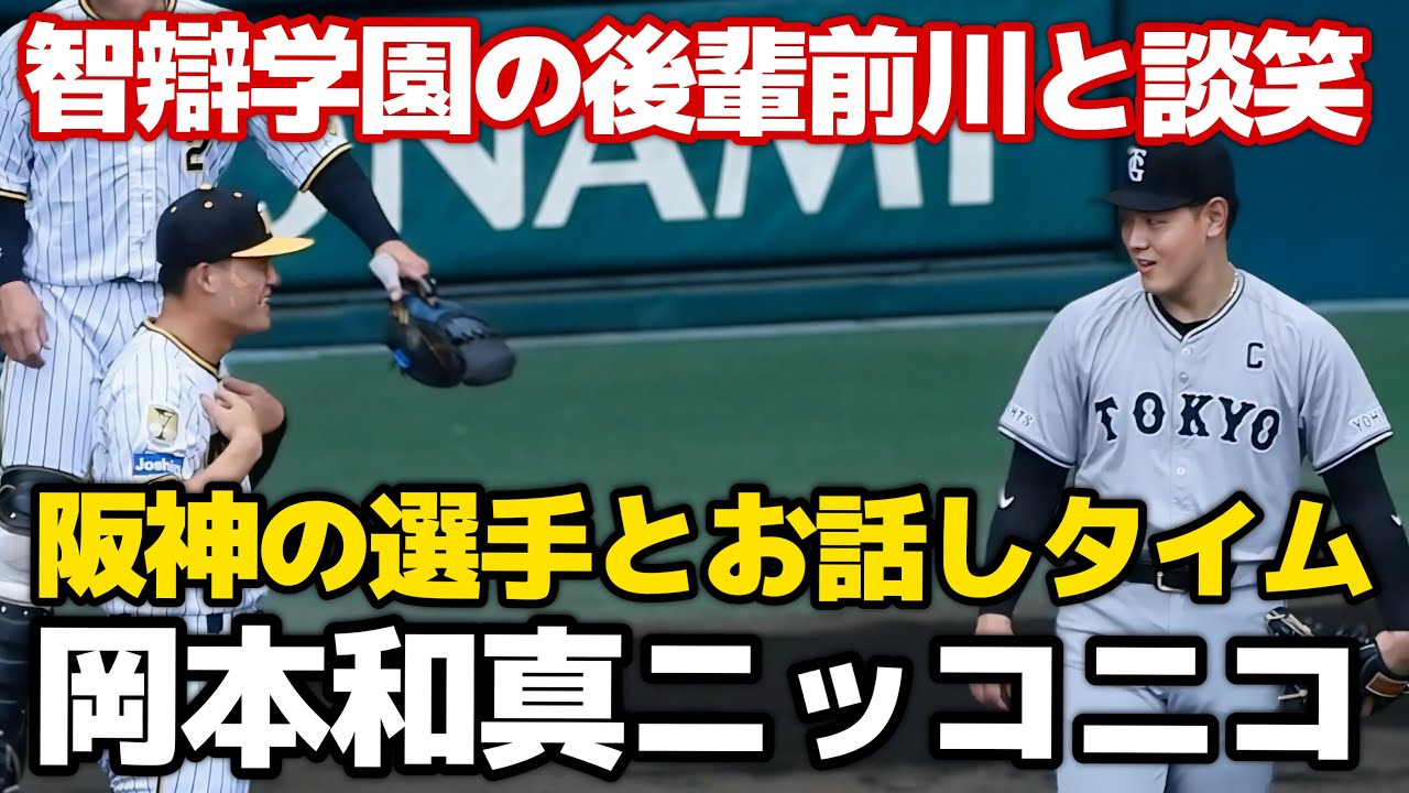 【嬉しさ隠しきれず】試合中絡み不可のレフトを守った岡本和真さん、試合前にたっぷり阪神の選手とお話しできてニッコニコになってしまう。智辯学園の後輩、前川とも笑顔で談笑 2024.7.30