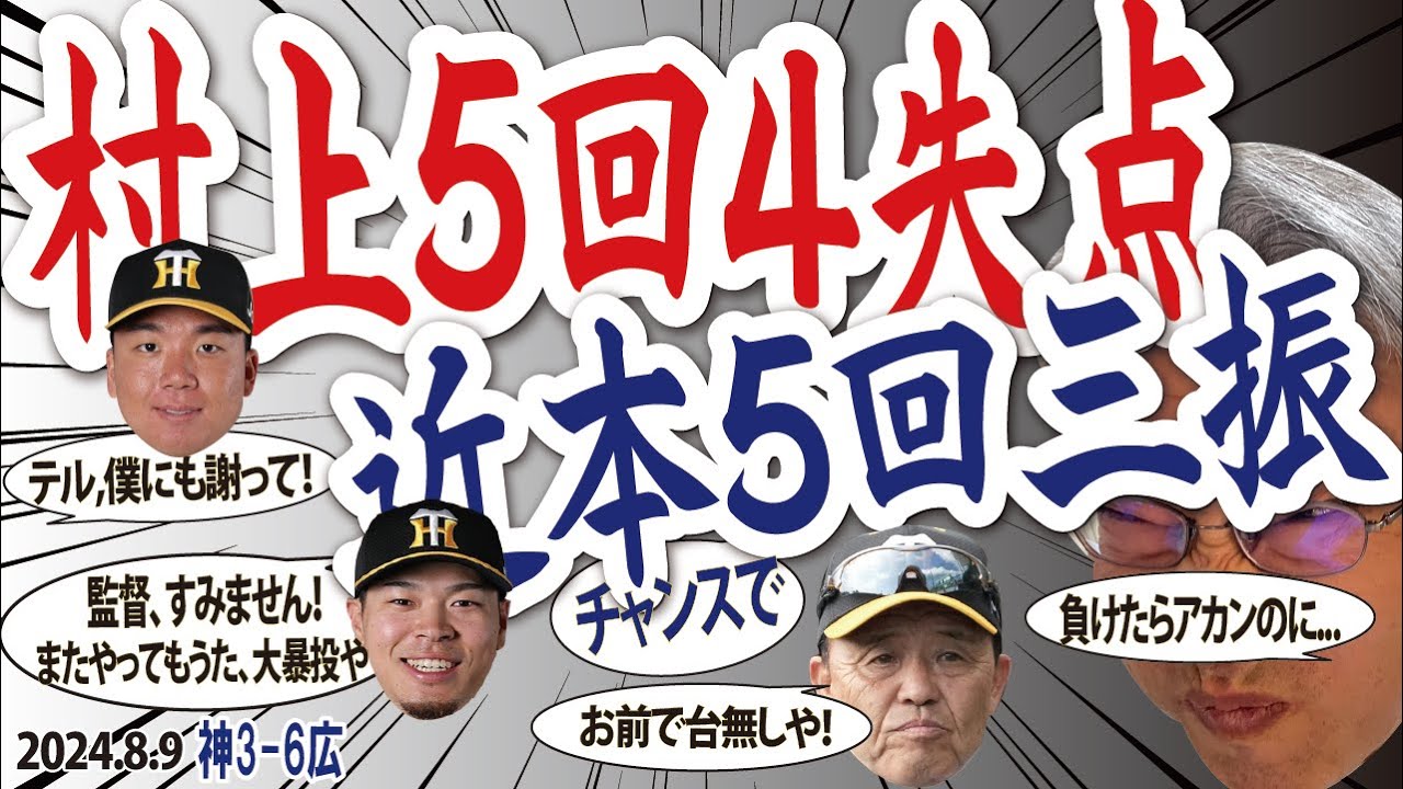 2024.8.9 神3-6広 T大事な初戦落とす!先発村上粘れず・5回4失点、打線5安打3点のみ追いつけず、 サトテル・先制タイムリーエラー