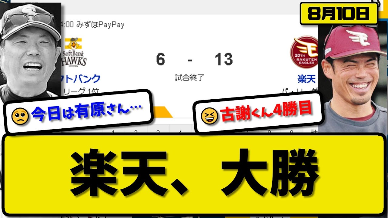 【1位vs4位】楽天イーグルスがソフトバンクホークスに13-6で勝利…8月10日17安打13得点で大勝…先発古謝5回6失点4勝目…阿部&小深田&村林&鈴木&辰己&太田が活躍【最新・反応集・なんJ】