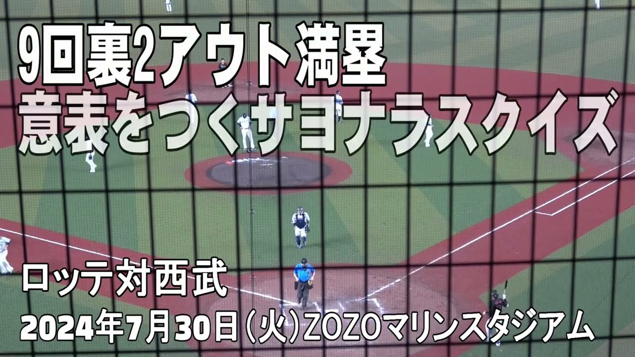 【小川龍成選手 サヨナラスクイズ成功】ロッテは西武に12連勝 2024年7月30日(火)ZOZOマリンスタジアム ロッテ対西武 12回戦 2階席2列目の座席で撮影 ロ6-6西 9回裏2アウト満塁 8番小川選手 アブレイユ投手の1球目 外角やや高めストレート バントした打球は三塁手のグラブを弾き送球できず 三塁ランナーの佐藤選手ホームイン サヨナラスクイズ成功 ロ 7-6 西 Chiba Lotte Marines千葉ロッテマリーンズ小川龍成 NPBHUB.COM | The Fanbase of Nippon Baseball & Nippon Professional Baseball