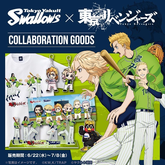 東京リベンジャーズの人気キャラクターがスワローズユニホームを身に纏った特別なデザインの他にも、つば九郎が東京リベンジャーズに仲間入りしたデザインのグッズが登場✨