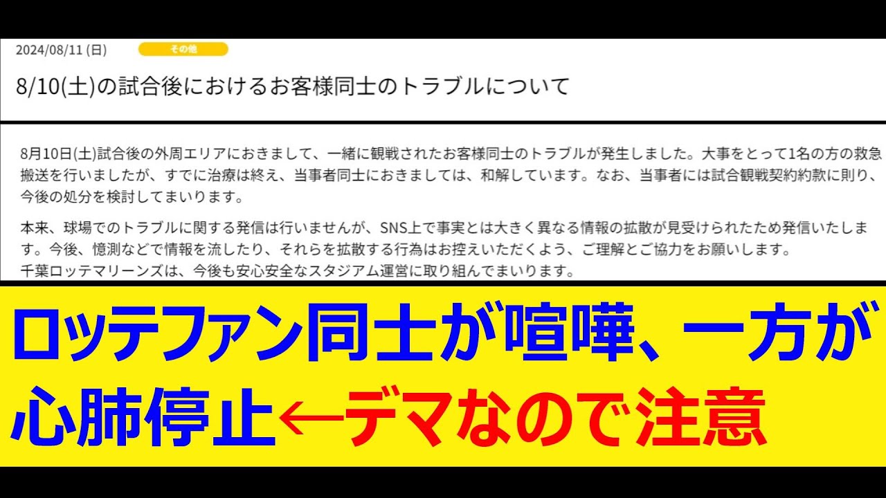 ロッテファン同士が喧嘩、一方が心肺停止←デマなので注意【プロ野球、なんj、なんg反応】【野球、2ch、5chまとめ】【千葉ロッテマリーンズ、ロッテ、マリーンズ】