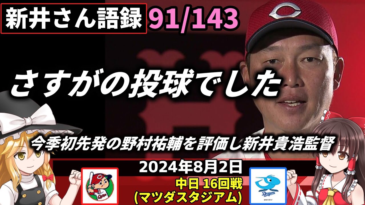 「さすがの投球でした」【新井監督語録:2024年8月2日】カープ零封4連勝。小園 六回技あり決勝打。野村攻めの今季初登板 5回無失点。救援左腕4投手リレー。ハーン2セーブ目 防御率0.00キープ。