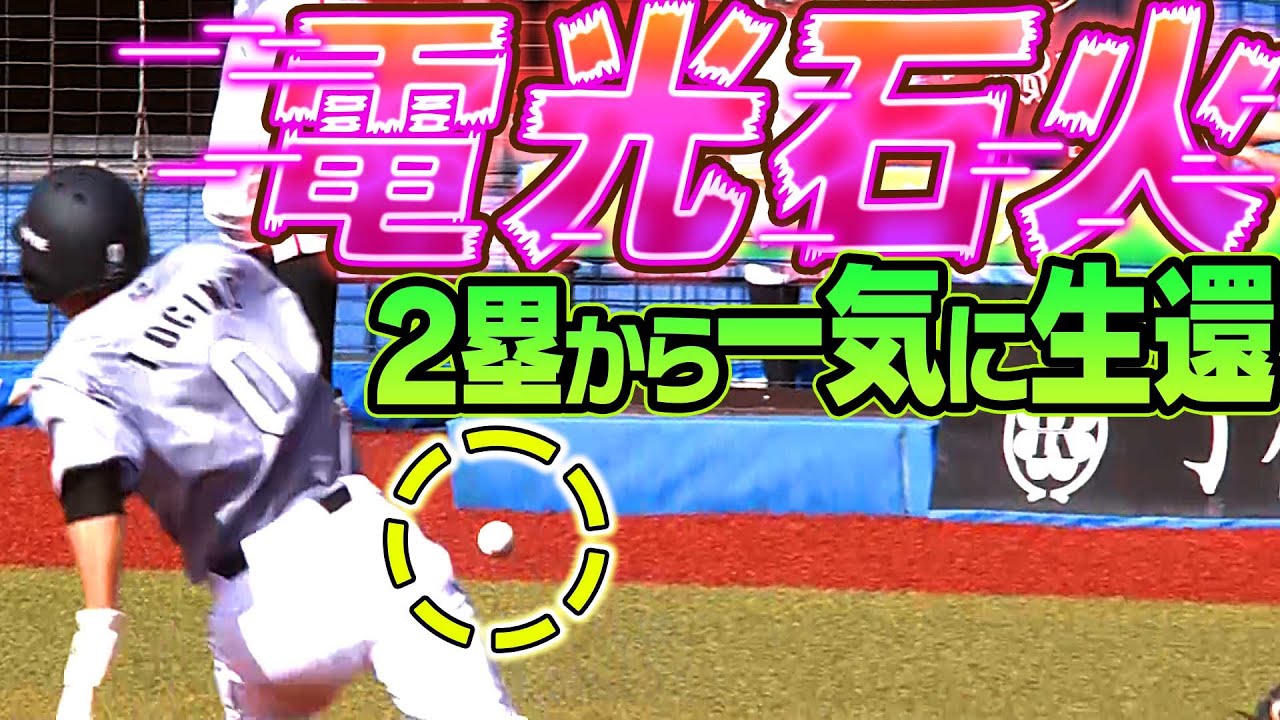 5回裏、サイン違いでキャッチャーが投球を捕りきれず。後ろにそれる間に2塁走者の荻野貴司が一気に生還。一瞬の隙を見逃さず、大きな1点をもぎ取った!!