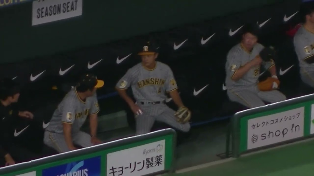 ベンチで楽しそうなベンチの渡邉諒や中野拓夢など(2024年8月13日 読売ジャイアンツ 対 阪神タイガース)