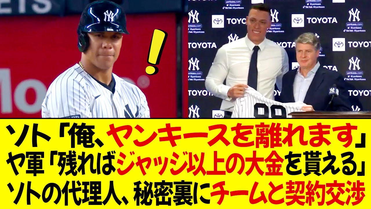 ソト「俺、ヤンキースを離れます」ヤンキース「残ればジャッジ以上の大金を貰える」ソトの代理人ボラス、秘密裏にチームと契約交渉を進める!
