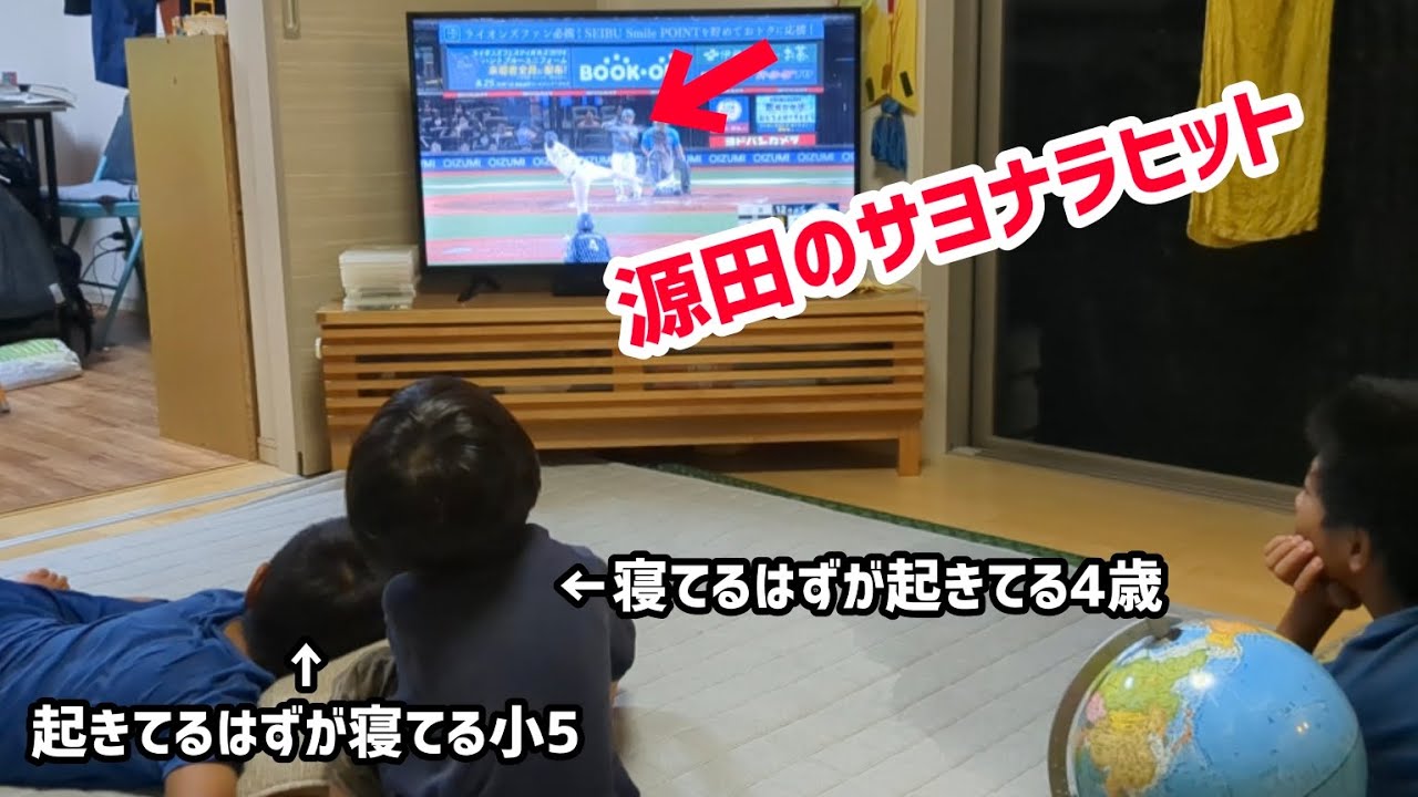 源田選手のサヨナラヒット!!夜遅いので寝ているはずの4歳(末っ子くん)は「サヨナラの匂い」を嗅ぎつけ完璧なタイミングで起きてきました😂