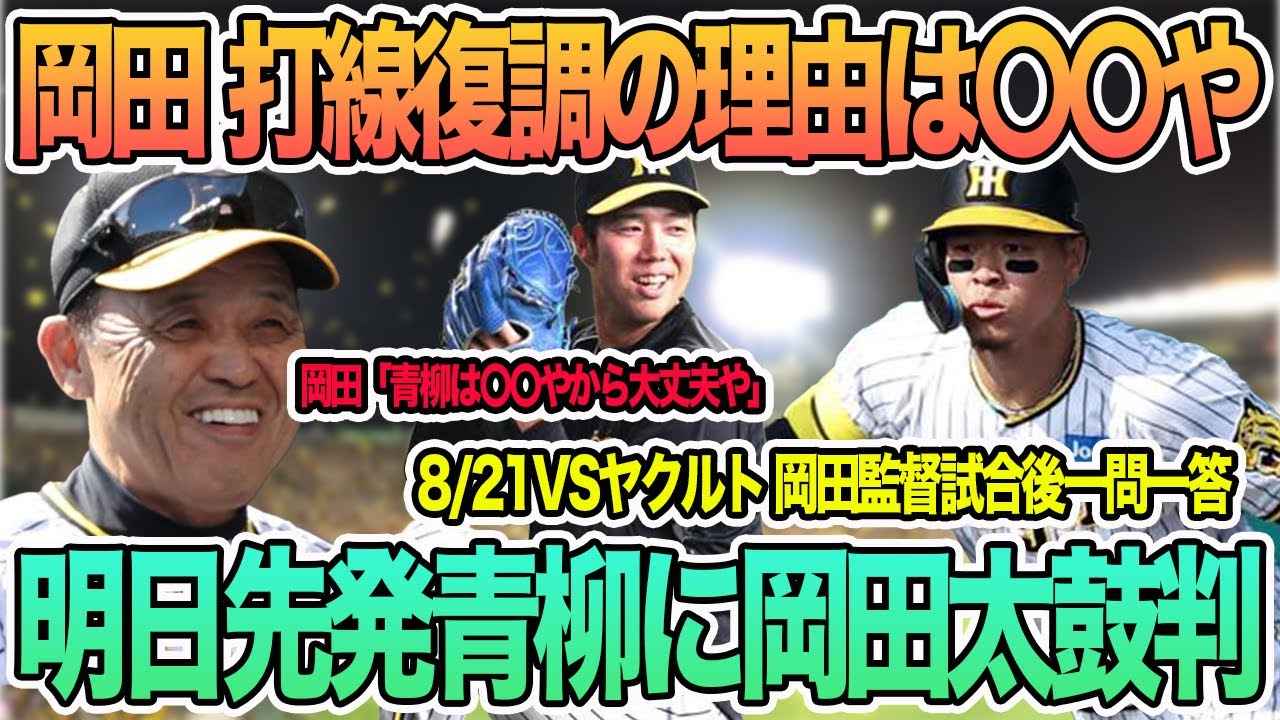 【岡田「打線復調の理由は〇〇や」】明日先発青柳に岡田太鼓判 8/21VSヤクルト 岡田監督試合後一問一答 #阪神 #阪神タイガース #岡田監督  #佐藤輝明 #大山悠輔 #西勇輝 #青柳 #石黒