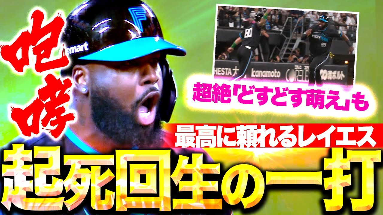 打撃好調の北海道日本ハム・レイエス。4回には万波中正のレフトへのヒットで2塁から一気に本塁生還!! さらに勝ち越しを許して迎えた9回の攻撃。スライダーを捉え左中間へ運んだ起死回生のタイムリー2ベースヒットを放つ!!! 19試合連続ヒットと打撃絶好調。優しき大男がチームを救う!!