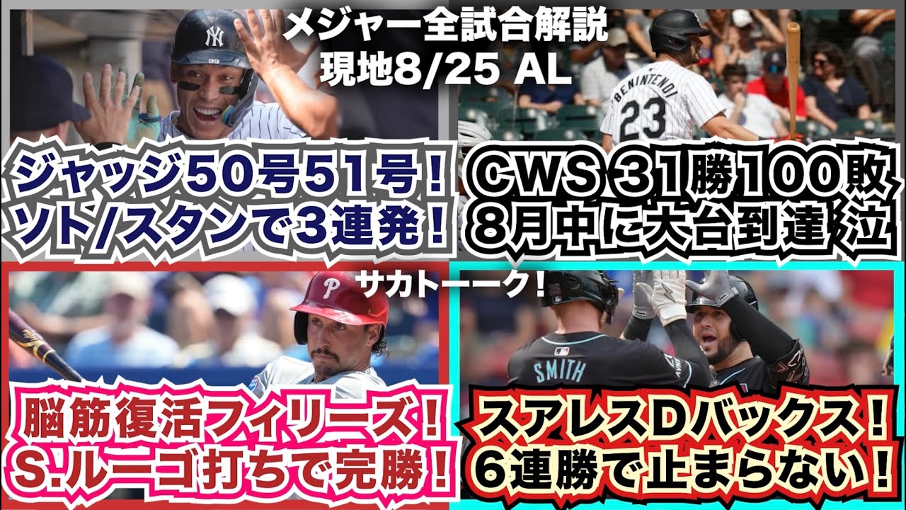 【AL8/25】ジャッジ50号51号!ソト&スタントンで3者連発!ホワイトソックス31勝100敗で8月中に大台到達(泣)脳筋復活フィリーズ!S.ルーゴ打ちで完勝!スアレスDバックス!6連勝止まらない!