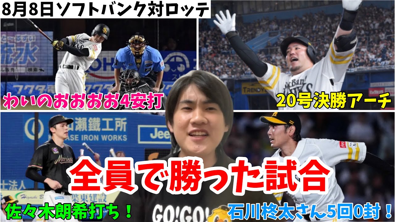【優勝へ】柳町4安打!栗原山川正木ホームランで首位攻防勝ち越し!石川柊太さん、復帰登板で好投をみせる!2024年8月8日 福岡ソフトバンク対千葉ロッテ
