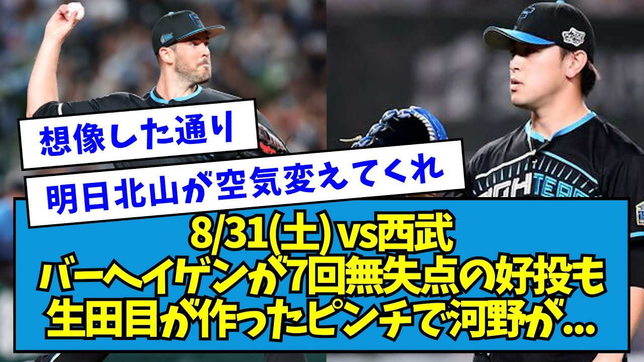 【逆転】vs西武バーヘイゲンが7回無失点の好投も 生田目が作ったピンチで河野が…【2024/08/31】【なんJ反応】