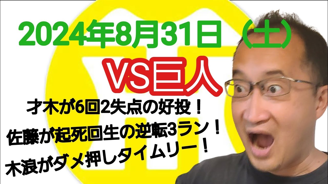 【阪神タイガースについて語る動画】2024年8月31日(土) ○ 阪神 4 × 2 巨人 ● 才木が6回2失点の粘りの投球! 佐藤が起死回生の逆転3ランホームラン! 木浪がダメ押しタイムリーヒット!