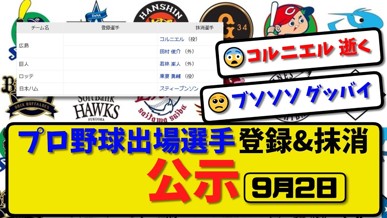 【公示】プロ野球 出場選手登録&抹消 公示9月2日発表|広島コルニエル&田村 巨人若林 ロッテ東妻 ハムスティーブンソンら抹消|ら登録【最新・まとめ・反応集・なんJ・2ch】 #阪神タイガース #広島カープ #横浜DeNAベイスターズ #読売ジャイアンツ #ヤクルトスワローズ #中日ドラゴンズ #日本ハムファイターズ #福岡ソフトバンクホークス #東北楽天ゴールデンイーグルス #オリックスバファローズ #千葉ロッテマリーンズ #西武ライオンズ #プロ野球 #反応集 #なんJ #5ch #2ch Yomiuri Giants若林晃弘読売ジャイアンツ NPBHUB.COM | The Fanbase of Nippon Baseball & Nippon Professional Baseball