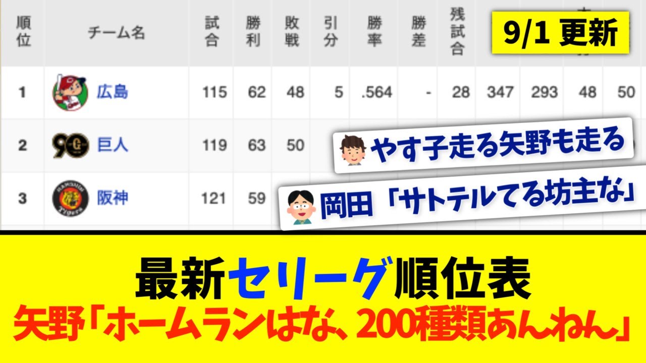 【9月1日】最新セリーグ順位表 〜矢野「ホームランはな、200種類あんねん」〜