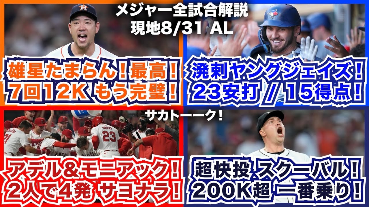 【AL8/31】雄星たまらん!最高!7回12Kでもう完璧!溌剌ヤングジェイズ!23安打15得点!アデル&モニアック!2人で4発サヨナラ!超快投スクーバル!200奪三振超 一番乗り!