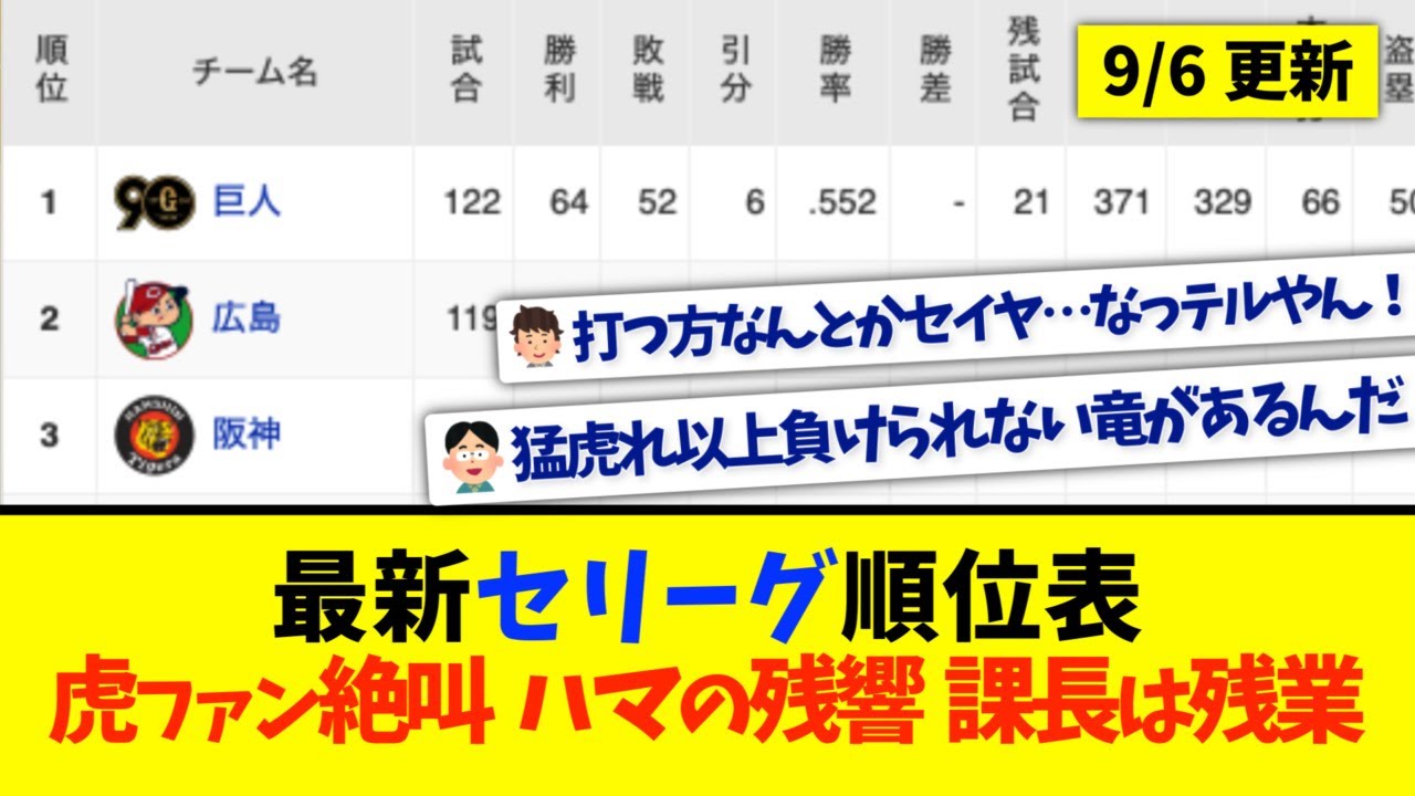 【9月6日】最新セリーグ順位表 〜虎ファン絶叫 ハマの残響 課長は残業〜