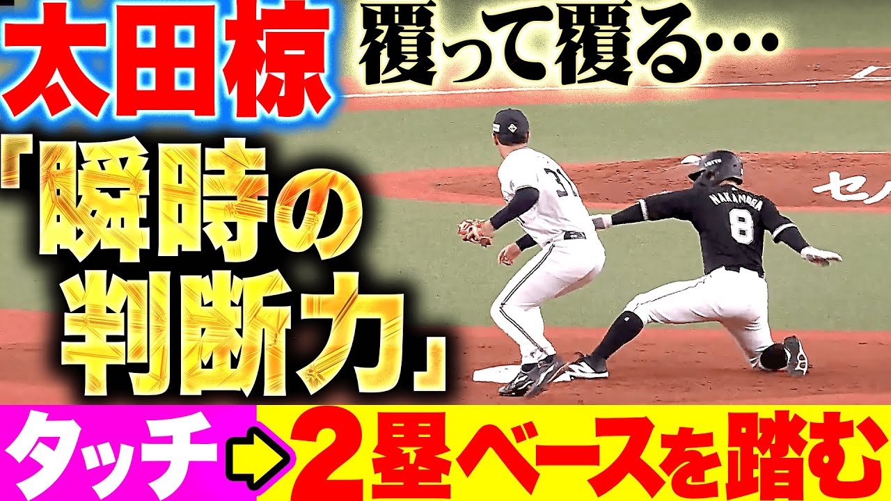 ん?何が起こったの…?判定が覆って覆った!? 1死1,2塁の場面で西川龍馬がダイレクトキャッチできず2塁へ送球。2塁走者・中村奨吾はキャッチしたと思い2塁に止まっていた。そこに太田椋は中村奨吾にタッチしてから2塁ベースを踏んだことにより、2塁走者、1塁走者ともにアウト。これがタッチの順番が逆だったら2塁走者はセーフで2死1,2塁となっていた。瞬時に判断した太田椋の好プレーとなった!!