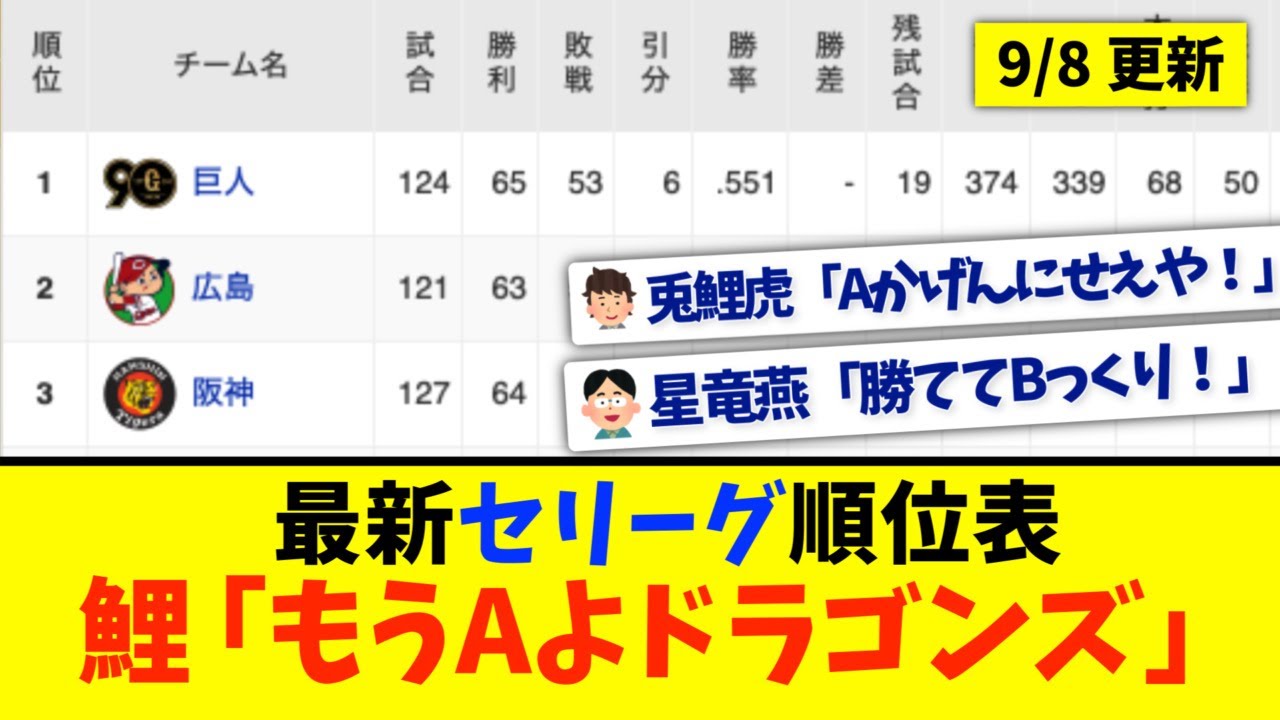 【9月8日】最新セリーグ順位表 〜鯉「もうAよドラゴンズ」〜