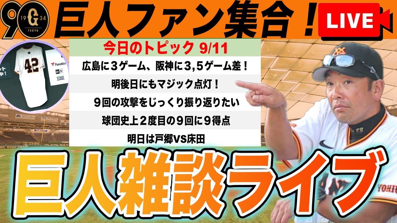 【祝勝会!巨人ファン集合】明後日にもマジック点灯!広島にマツダで連勝!9回の攻撃振り返るなど巨人雑談ライブ 読売ジャイアンツ