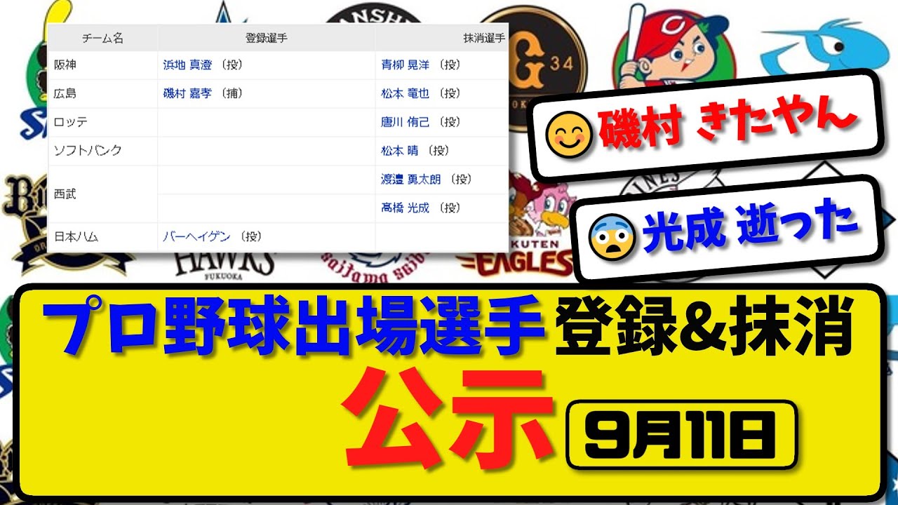 【公示】プロ野球 出場選手登録&抹消 公示9月11日発表|阪神青柳 広島松本 ロッテ唐川 ソフ松本 西武渡邉&高橋ら抹消|阪神浜地 広島磯村ら登録【最新・まとめ・反応集・なんJ・2ch】