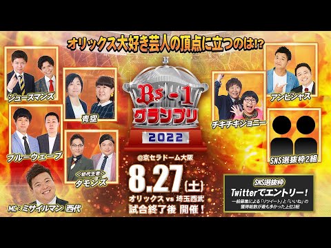 オリックス大好き芸人たちが京セラドーム大阪に集結し、次々とバトルする「第2回Bs-1グランプリ」を、Bs夏の陣2022期間中の8月27日(土)試合終了後に開催!また、今回は事前にTwitterにて一般募集によるSNS選抜も実施!「リツイート」と「いいね」の獲得総数が最も多かった上位2組に「第2回Bs-1グランプリ」への出場切符が与えられます!