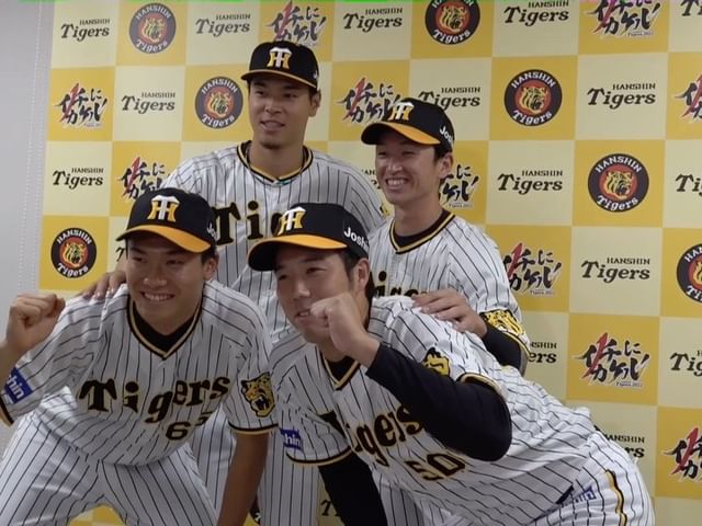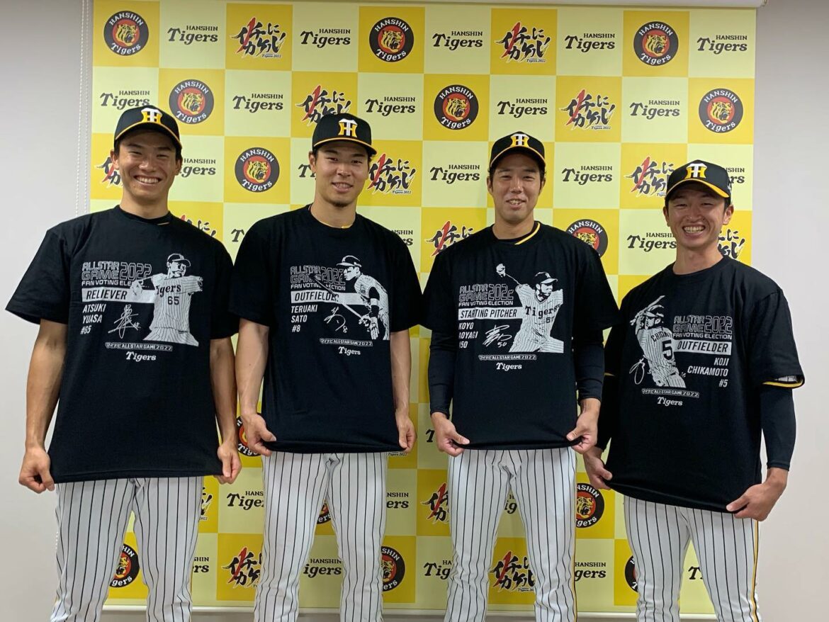 青柳選手、湯浅選手、佐藤輝明選手、近本選手の「マイナビオールスターゲーム2022」ファン投票選出を記念したオリジナルグッズを7/14(木)より発売します!グッズ担当者のために、どのカメラよりも笑顔で撮影に協力する4人の様子も合わせてご覧ください!