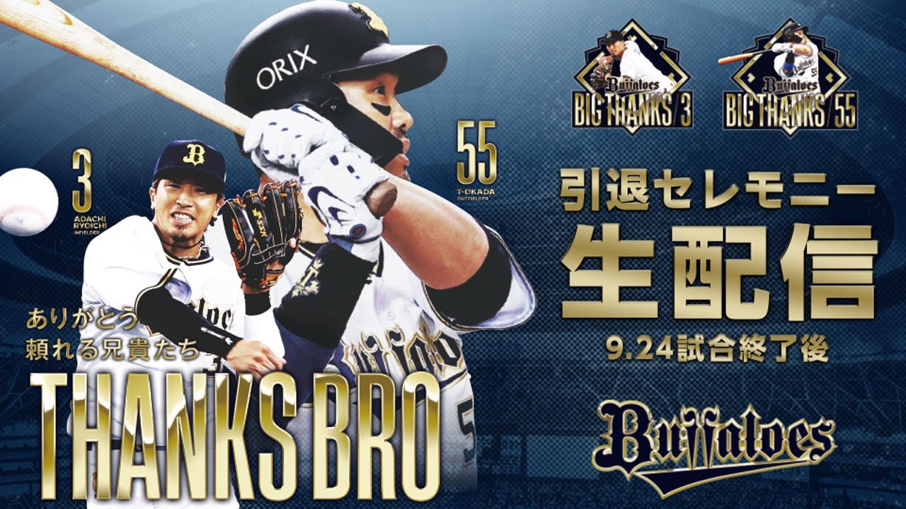 2024シーズンをもって現役を引退するT-岡田選手、安達了一選手の引退セレモニーの様子を生配信いたします。球場にお越しでない皆さまもぜひリアルタイムでご覧ください!