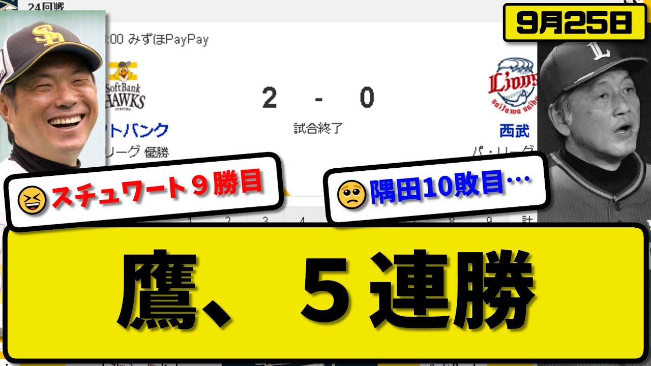 【1位vs6位】ソフトバンクホークスが西武ライオンズに2-0で勝利…9月25日5連勝…先発スチュワート5回無失点9勝目…山川&谷川原が活躍【最新・反応集・なんJ・2ch】プロ野球