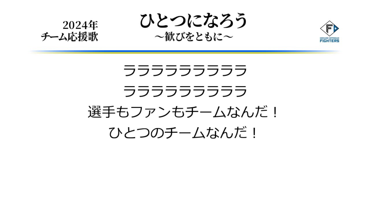 北海道日本ハムファイターズ ひとつになろう~歓びをともに~ [MIDI] 日本ハムの試合勝利後によく歌われるチーム応援歌です。 発表当初から「喜びのうた」→「ファイターズファンの唄」と変遷して、 使用開始2年目の’15より現在の曲名で定着しています。 低迷期を経て、今シーズンは6年ぶりのAクラス入りを決めたチームに、 これまでとは違った歓びを抱いていらっしゃるファンの方も多いのでは。 Hokkaido Nippon-Ham FightersHokkaido Nippon-Ham Fighters (Baseball Team)なんぶふじひとつになろう~歓びをともに~北海道日本ハムファイターズ応援歌 NPBHUB.COM | The Fanbase of Nippon Baseball & Nippon Professional Baseball