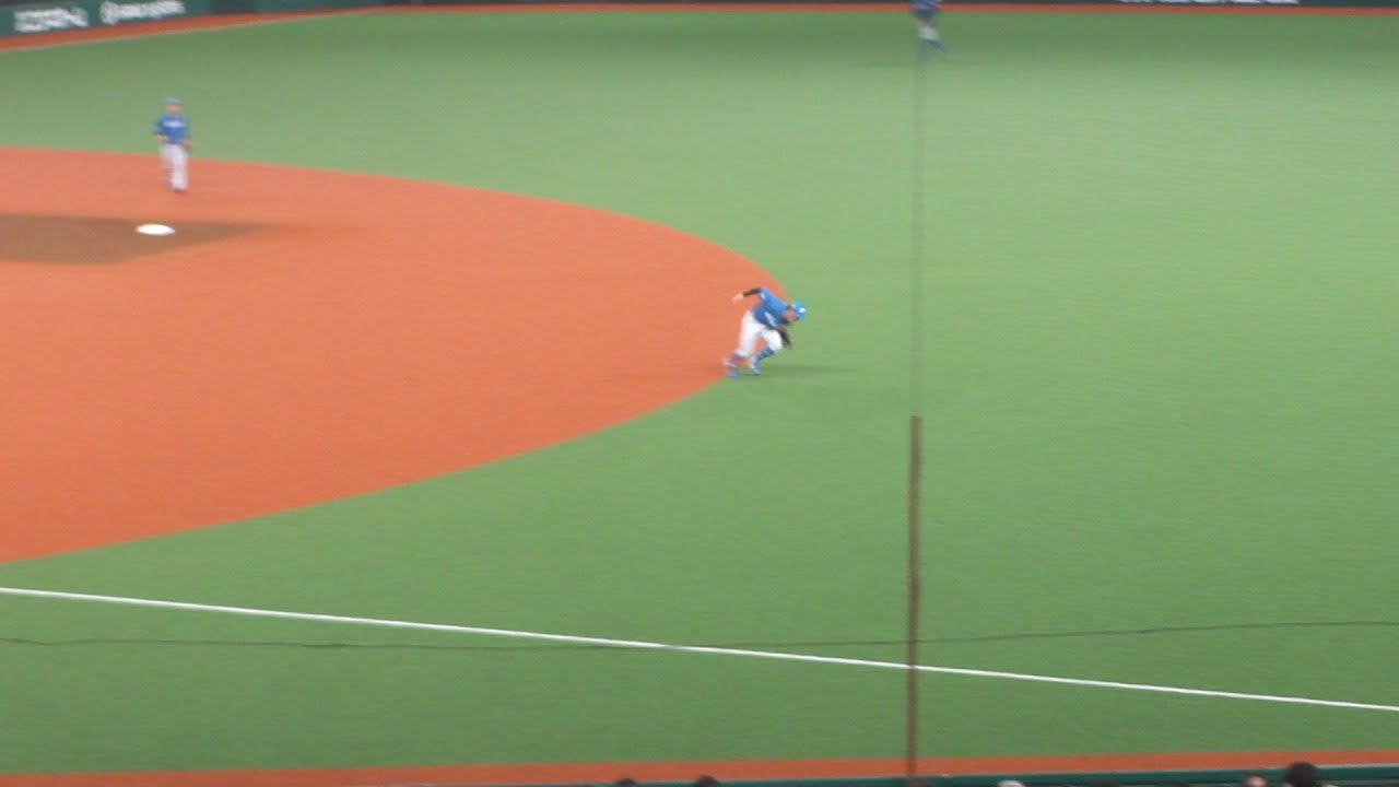 7回裏1アウト2塁で、セカンド細川凌平が、炭谷銀仁朗のゴロをキャッチ後、回転して1塁送球しアウト。