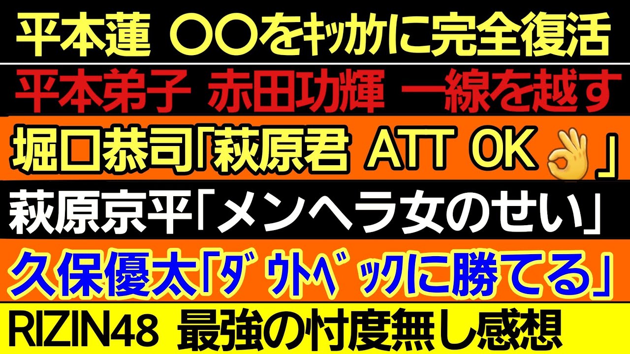 〇平本蓮 太田忍敗戦でテンションMAX〇平本弟子 赤田 一線を越す〇堀口恭司「萩原京平 ATTで迎えるよ」〇萩原京平 DV報道に「メンヘラ女」〇久保優太「ダウトベックに勝てる」〇K-1選手 MMA転向